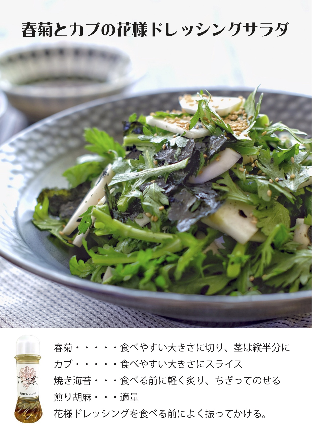今が旬の春菊とかぶは花様ドレッシングにとてもマッチします。